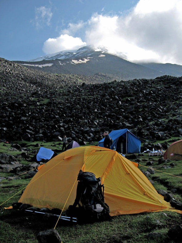 К лагерю 3200 тропа идет по склонам горы, поросшими травой. Много летовок курдов, в которых они живут летом и пасут свой скот - овец, коров и лошадей. Выше 3200 начинается типично вулканический ландшафт - разрушенные лавовые потоки, вулканические бомбы - россыпи выброшенных вулканом камней и выжженные поля туфов. Растительности практически нет - мелкая трава, да цветочки только. Курды взялись организовывать нам какой-то сервис. Но как то все по-курдски у них получилось. Неуклюже малость. Повар потерялся где-то, потом потерялись наши рюкзаки. Слава Богу рюкзаки нашлись. А вот повар так и не нашелся J)